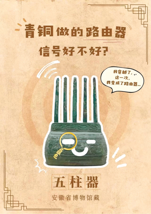 “显眼包”里,黄玻璃脊兽是“社恐打工人”——“圆溜溜的眼睛、微微皱起的眉毛,像不像被点名发言的你,眼神中突然闪过一丝慌乱”;东汉彩绘鸟兽鱼纹漆槅成了“三国时代高端人士的限定款”,因为能一人独食还被推荐为“对社恐人士友好”;西周云纹铜五柱器与现代路由器“跨时空撞脸”,围绕它的用法上演了延续千年的“我猜我猜猜猜”……这些网感十足的注解,瞬间拉近了文物和年轻人的心理距离。